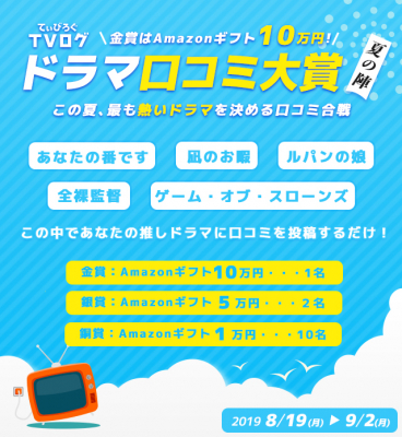 金賞はamazonギフト10万円 Tvログ が ドラマ 口コミ大賞 夏の陣 この夏 最も熱いドラマを決める口コミ合戦 を実施 株式会社 猿 プレスリリース配信代行サービス ドリームニュース