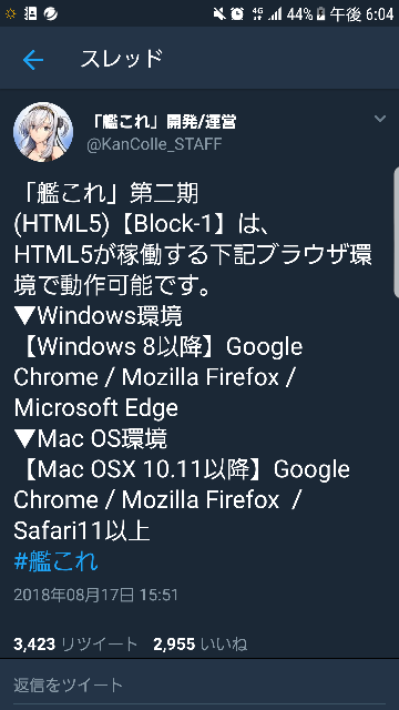 艦これ公式android先行運用版は本日のアップデート後から 推奨環境を確認せよ Orefolder